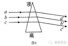 我们都知道近视镜片看物体是缩小的,远视镜片看物体是放大的,为什么呢?研究这个问题就要先知道透镜的最基本的光学单位——三棱镜。三棱镜是由两个平面相交形成的三角形的透明柱,因为两个折射面均为平面,所以三棱镜是没有屈光力的,光线经过三棱镜后不会发生会聚或发散作用,但却会发生传播方向的改变(如图6),通过三棱镜看物体物体都会向尖的方向移动,就是因为这个原因三棱镜在斜视的检查和配镜中经常被使用。如果光线经过三棱镜后在1m的距离上偏移1 cm我们就称为1个棱镜度(1Δ),表示三棱镜时需要棱镜大小和棱镜基底方向,基底方向常用的有基底朝上、基底朝下、基底朝内、基底朝外。三棱镜是组成眼用透镜的最基本的光学单位,任何透镜都可看成是无数个三棱镜按照一定的规则排列组成,凸透镜是由底相对的大小不同三棱镜旋转组成,凹透镜是由顶相对的大小不同三棱镜旋转组成。当我们通过凸透镜看物体时,物体上发出的光线都会经过底向光心尖端向四周的三棱镜折射,物像都向着尖端(镜片四周)移位,所有的移位点形成了物像,就感觉物体放大了,相同的道理凹透镜就缩小了(如图7)。