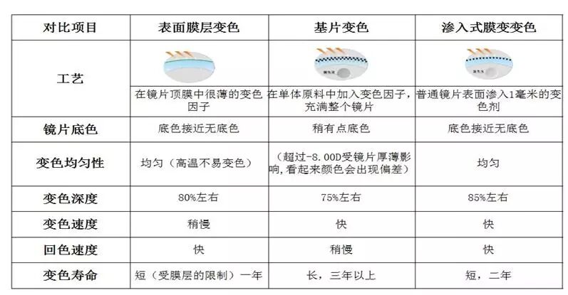 这3种系类里面,主要总结一下分为膜变、基变、渗透式膜变。市面上销售的变色片中,基片变色类型的变色片比表面膜层变色的变色片价格更加实惠,其使用寿命也更加长久。但是,表面膜层变色的变色片在镜片底色、镜片均匀性、变色回色速度方面更具备优势。此外,变色片的使用寿命也与当地的紫外线强度有关,具体的使用寿命要参照佩戴者所在地的紫外线强度来看。