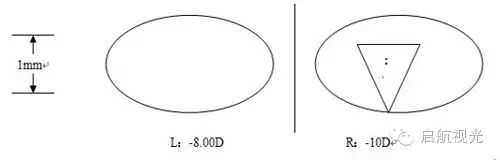 瞳高是指瞳孔中心到眼镜框下缘水平切线的垂直距离。借助全自动、半自动磨边机,我们加工眼镜极少出现左右眼两镜片光学中心不在同一水平线上的问题。如果我们加工眼镜前不测量瞳高,一旦眼镜佩戴者双眼瞳高不一致,那么即使是一副加工合格的不存在光学中心垂直互差的眼镜也会引起使用者的不适应,其原因是产生的垂直棱镜效应所致,当垂直棱镜效应超过1.5Δ 人眼将会因难以融合而出现不适症状,所以屈光度数高者几乎不允许眼镜有垂直互差的存在。例如:某人右眼屈光度-10.0D,右眼瞳高15mm;左眼屈光度-8.00D,左眼瞳高16mm,如果按照左右眼瞳高皆为16mm加工眼镜,垂直互差1mm,平视前方时右眼实际将产生10×0.1=1ΔBD的棱镜效应(如图2所示)。