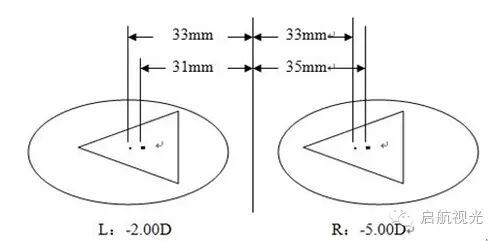 但是绝大多数人双眼屈光度数及左右眼别的单眼瞳距并不相同。加工眼镜时如果对两镜片的光心作相同的移位,则戴镜者双眼瞳孔中心都不能与镜片光心对应,尤其是屈光度数较高者与屈光参差患者戴镜时,棱镜效应最终将导致视力疲劳。例如:某人右眼屈光度-5.0D,右眼瞳距35mm;左眼屈光度-2.0D,左眼瞳距31mm,如果仅仅测量双眼视远瞳距66mm,按照左右眼分别为33mm加工眼镜,右眼将产生0.2×5=1ΔBO,左眼将产生0.2×2=0.4ΔBI(如图1所示)