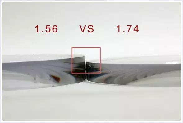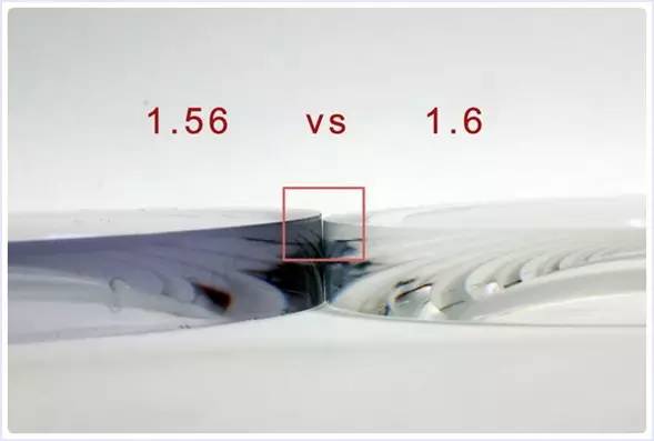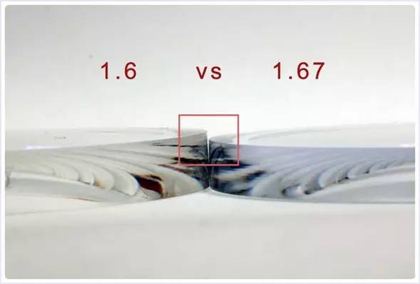 我们实际以近视-6.00度的不同折射率镜片做比较镜片的厚薄度