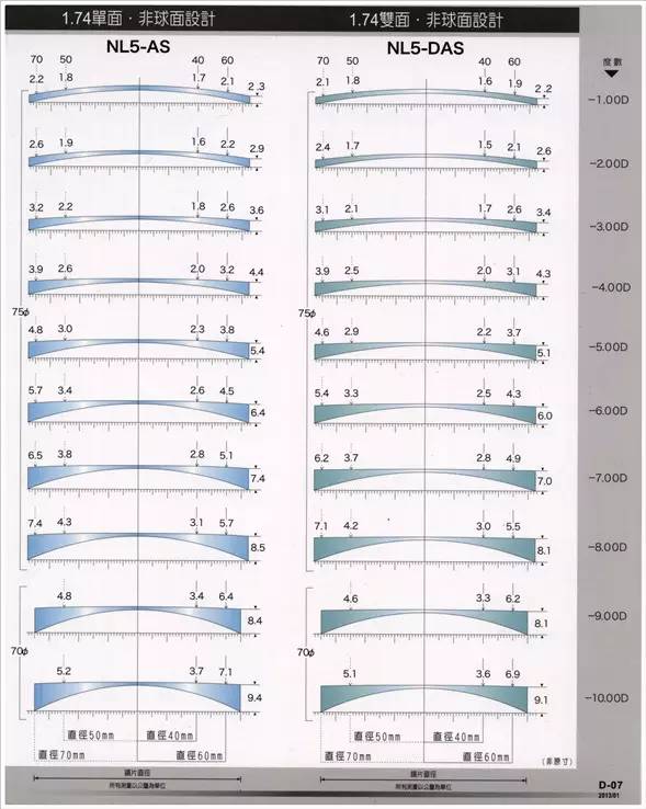 ↑ 1.74非球面与1.74双面非球面-1.00D~-10.00D的厚度图