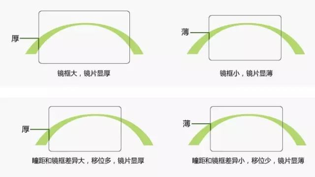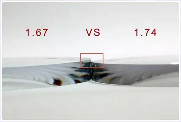 之前就告诉过各位看官,镜片厚薄度的问题不只跟折射率相关,其中包括瞳距(PD)、镜片大小、矫正度数、散光轴度、 球面与非球面等都会影响。有些人会想,我只要选择最高的曲折率我的镜片一定是最薄的,但是在以上条件影响下,以近视度数-100的客人来说,其实折射率1.56与1.67做出来的镜片根本就比较不出厚薄差别,建议消费者用合理的花费来满足自己矫正视力的需要。
