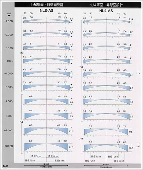 ↑ 1.6非球面与1.67非球面-1.00D~-10.00D的厚度图